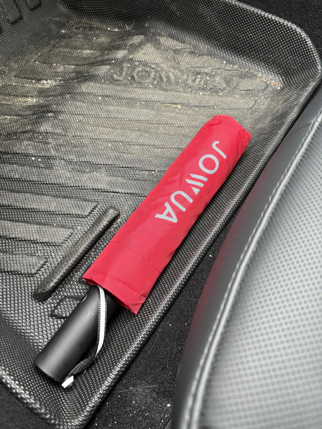 Five umbrellas are showcased, featuring an anti-rebound inverted design for convenient use. Available in red, blue, black, gray, and white colors, each umbrella proudly displays the "JOWUA" brand on a panel. These water-repellent Tesla Color Matching Umbrellas are arranged in two rows against a plain background.